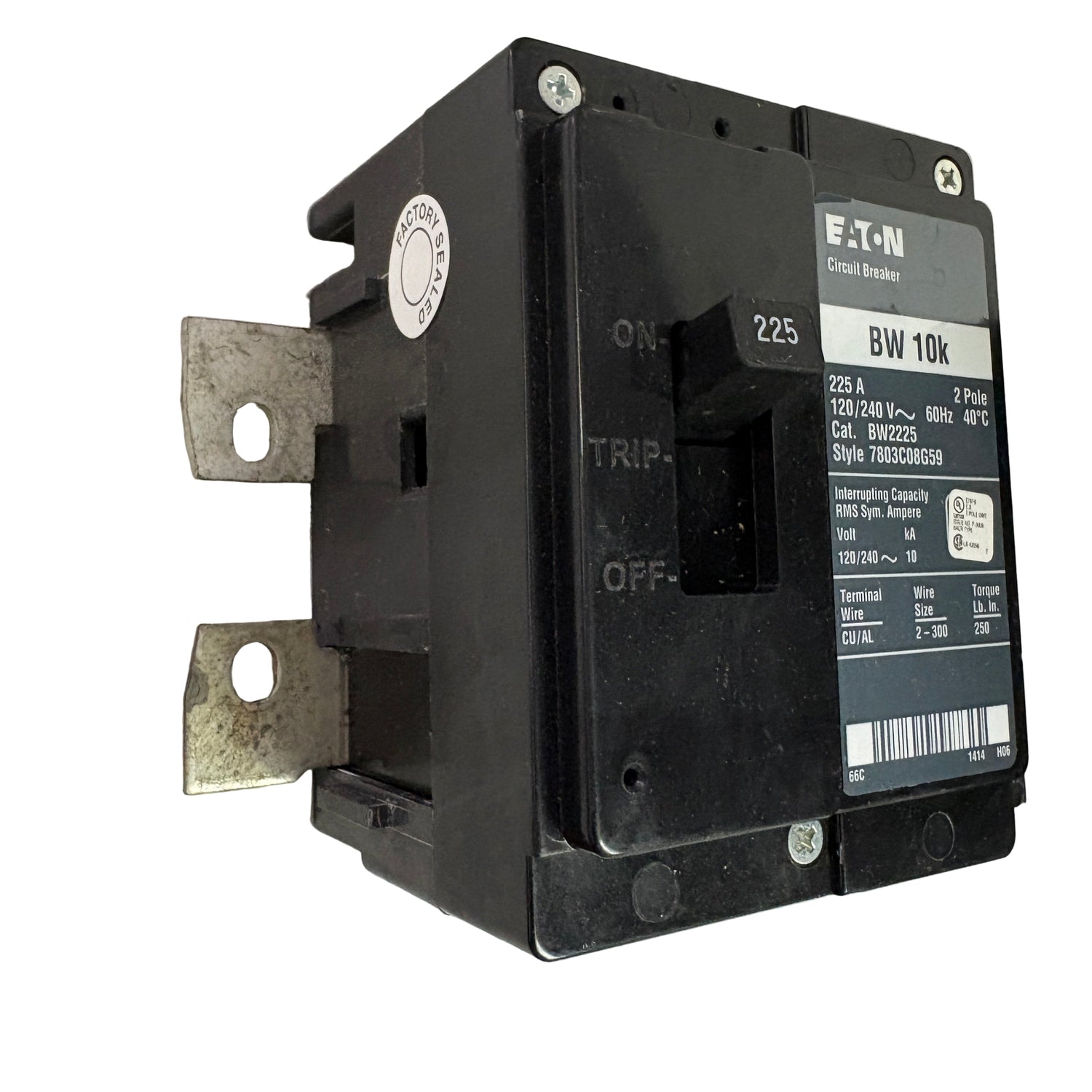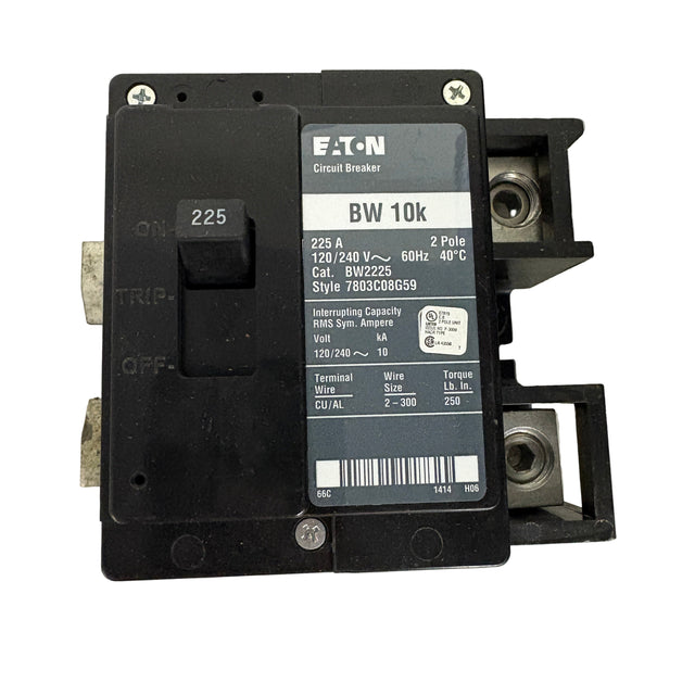 This Eaton Type BW Bolt-on circuit breaker is a two-pole, 225 amp breaker with a 10 kAIC interrupting capacity at 240V. It features bolt-on installation and is compatible with 120/240V systems. This breaker offers both long time and instantaneous trip functions as well as a thermal magnetic protection.