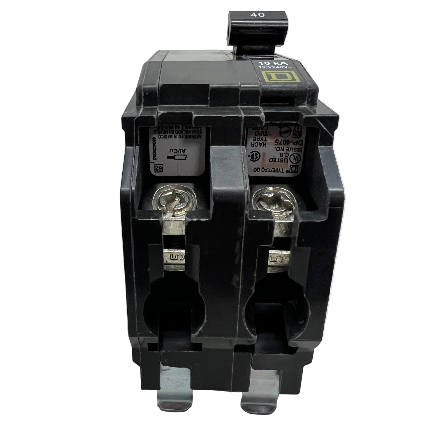 Square D QO240 is a 2-pole, 40A thermal magnetic circuit breaker for 120/240VAC systems with 10kA breaking capacity. Features include VisiTrip indication, trip-free toggle mechanism, and plug-in mounting. UL Listed.