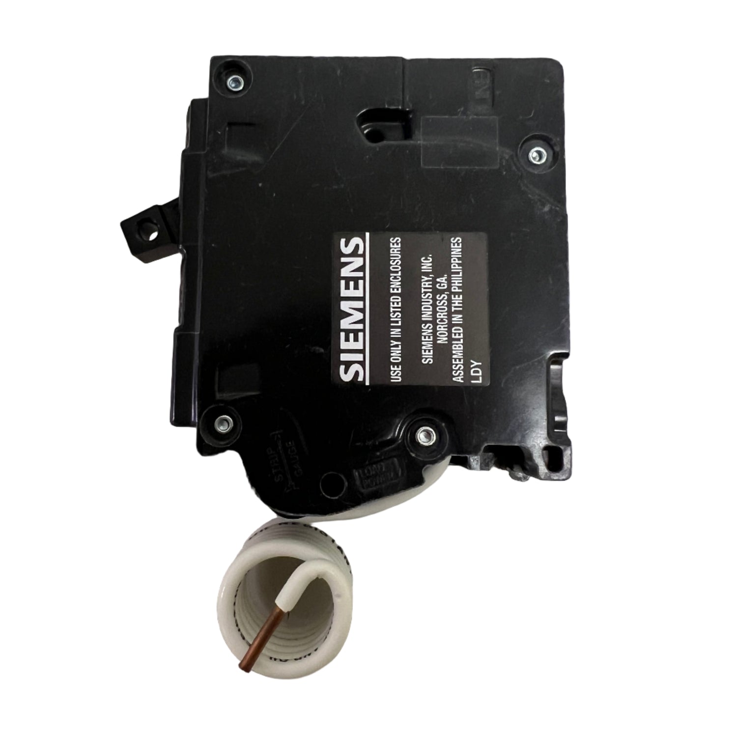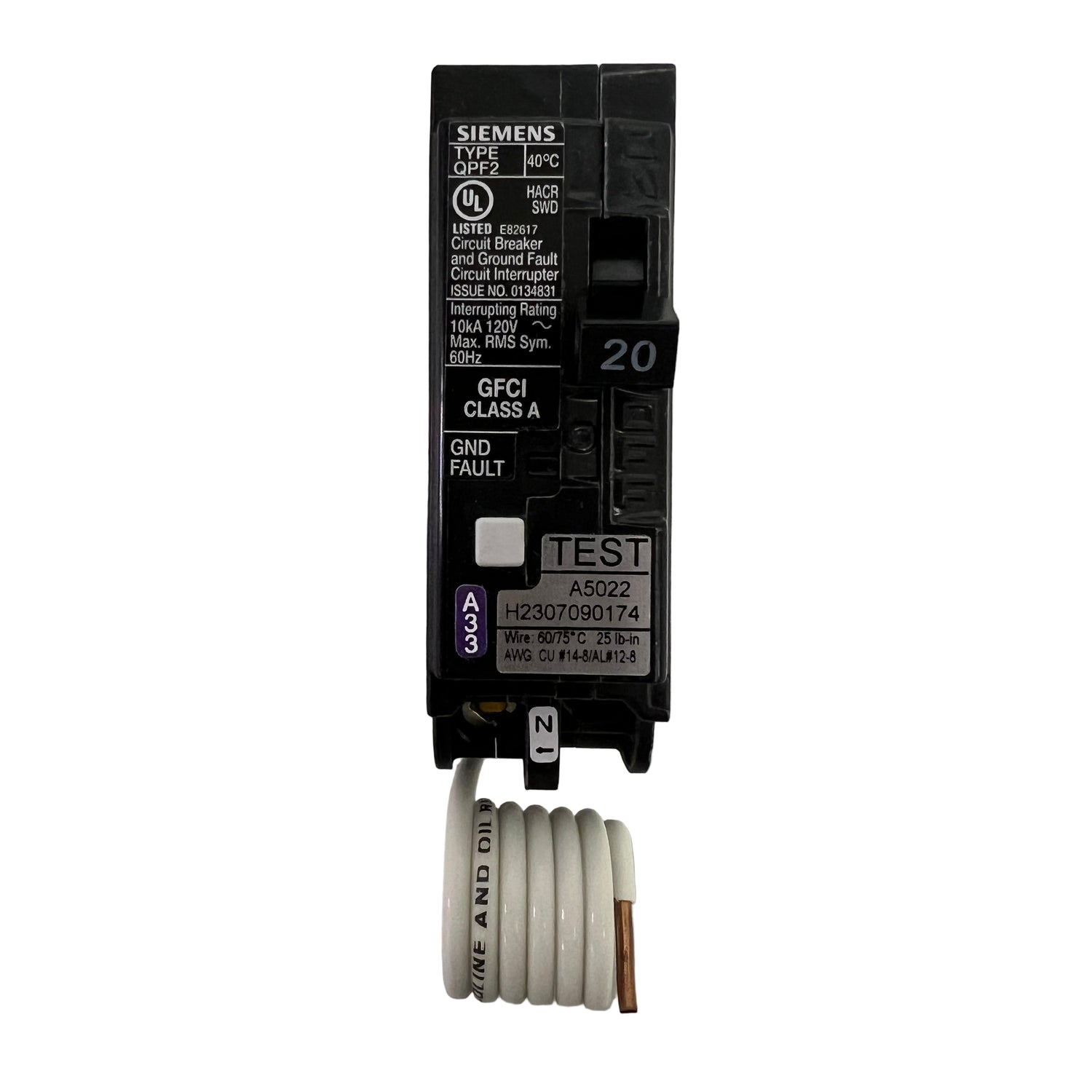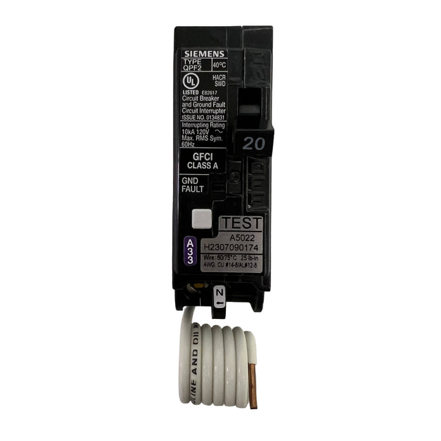 This Siemens QF120A circuit breaker features a 1 Pole molded case design and is equipped with a 20 Amp current rating, 120VAC voltage rating, and 10kAIC@120V interrupting rating. It offers a plug-in connection with a pigtail neutral wire, and long time and instantaneous trip functions.