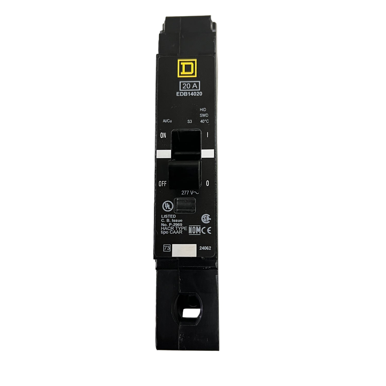 The Square D EDB14020 is a reliable, high-quality circuit breaker designed for use in NF Panelboards. It offers superior overload and short circuit protection, with a thermal-magnetic trip unit and signal indicator. This 20A, 3-pole breaker has an operating voltage of 480Y/277 VAC and a maximum interrupt rating of 25 kA at 120 VAC. It is HACR rated, and is UL Listed as High Intensity Discharge.